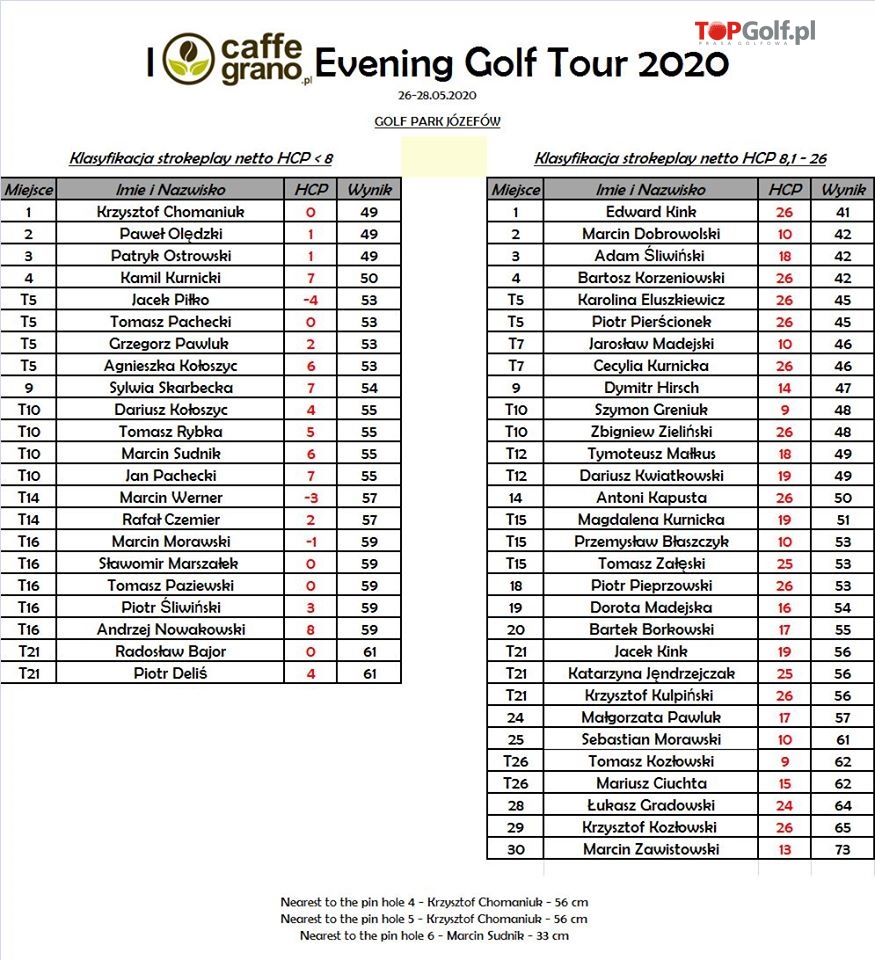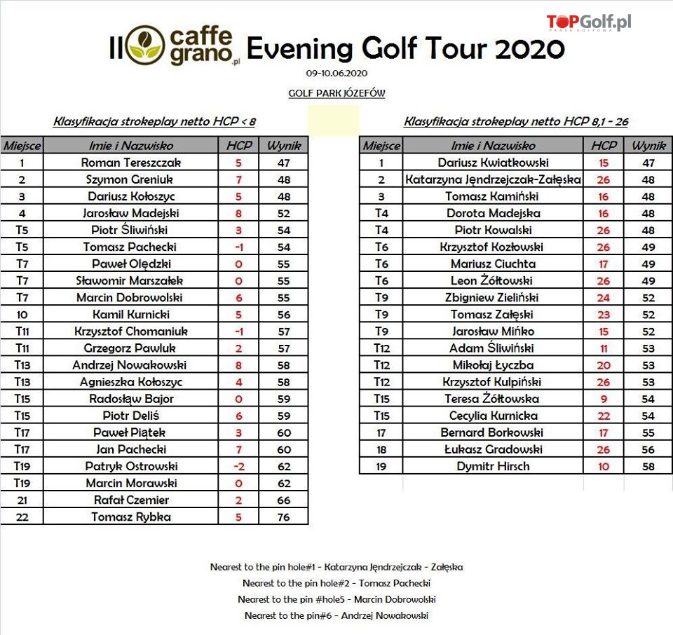 Ponadto w każdym cyklu turnieju ( wtorek & środa & czwartek ) nagradzamy najlepsze trzy wyniki w grupie hcp gpj <8 i hcp gpj 8,1-26.