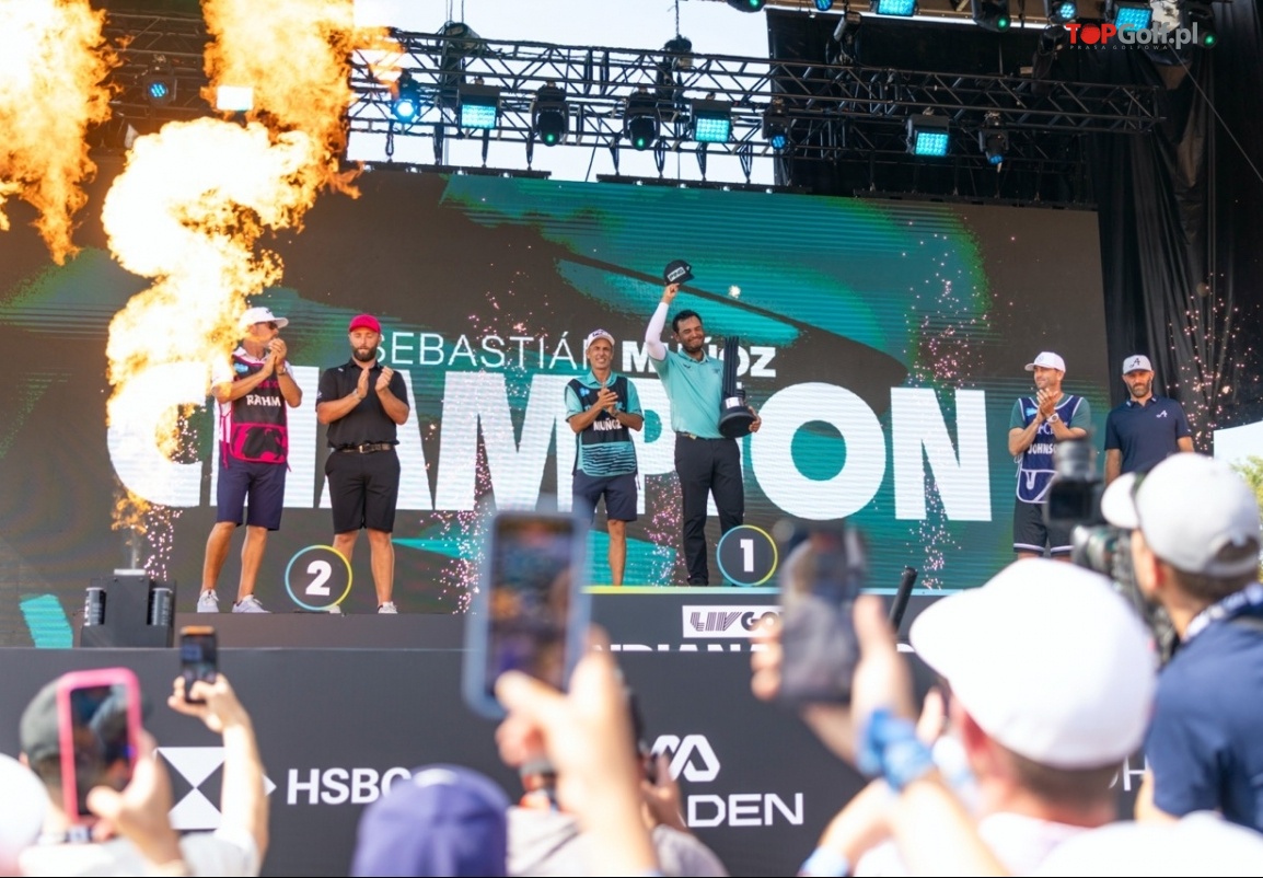 FOT: LIV Golf Indianapolis2025, indywidualny mistrz, kapitan Jon Rahm z Legion XIII i indywidualny mistrz, który zajął pierwsze miejsce, świętują podczas ceremonii wręczenia trofeów po ostatniej rundzie LIV Golf Indianapolis w klubie The Club at Chatham Hills w niedzielę, 17 sierpnia 2025 r. w Westfield w stanie Indiana. (Zdjęcie: Scott Taetsch/LIV Golf)